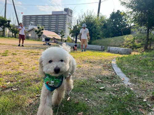 公園のお友だち 暑いけれど 元気です ムーチョは首周りとお腹に保冷剤を巻いています