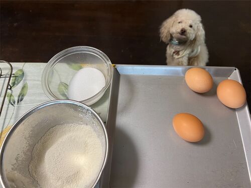 ムーチョの記念日 材料三つで 卵3つ、小麦粉40g、砂糖60g メロンのロールケーキを作って ムーチョのうちの子記念日 こんなに小さかった